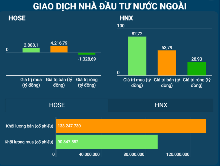 Nhà đầu tư nước ngoài tiếp tục gia tăng mạnh giao dịch trong phiên hôm qua, tiếp tục bán ròng mạnh trên HoSE với giá trị 1.317,43 tỷ đồng. Đây là đang là chuỗi bán ròng đột biến liên tiếp của khối ngoại, mua ròng trên HNX với giá trị 3,99 tỷ đồng.
