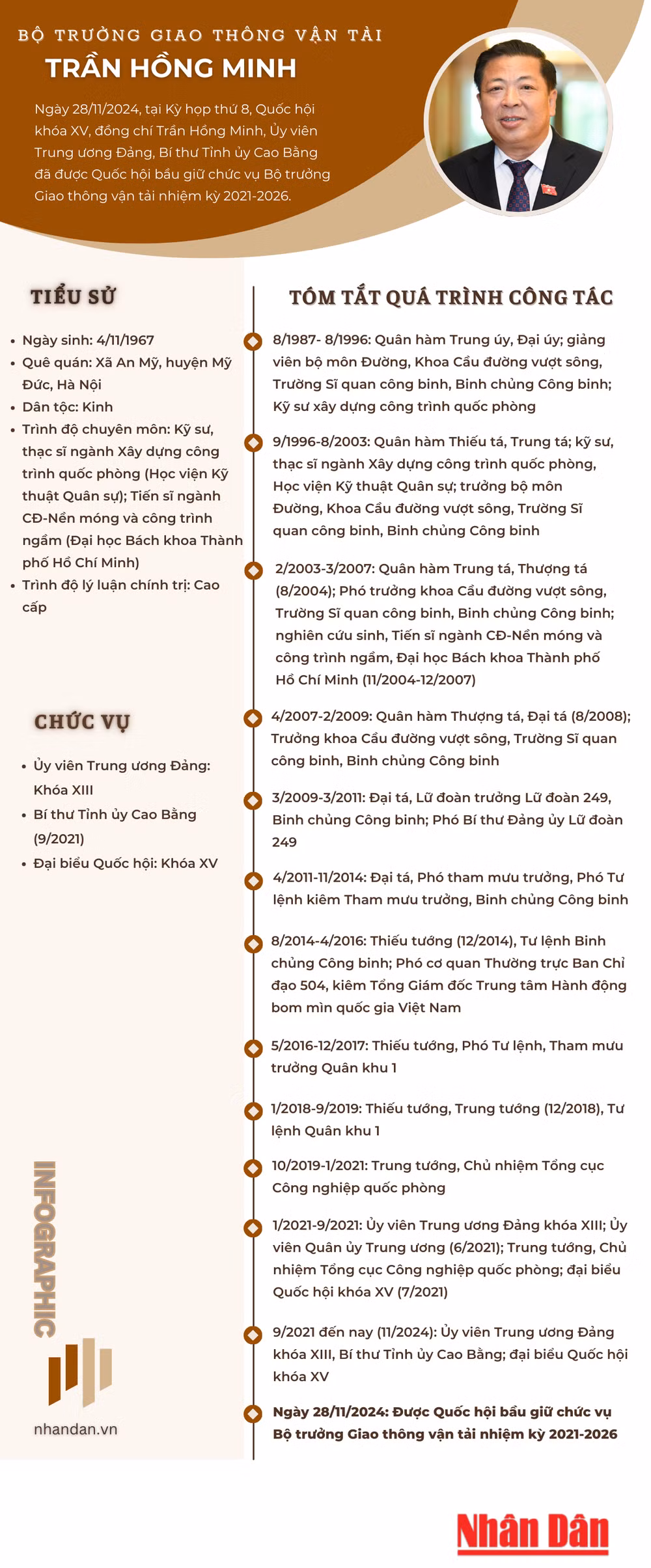 Ngày 28/11, tại Kỳ họp thứ 8, Quốc hội khóa XV, đồng chí Trần Hồng Minh, Ủy viên Trung ương Đảng, Bí thư Tỉnh ủy Cao Bằng đã được Quốc hội bầu giữ chức vụ Bộ trưởng Giao thông vận tải nhiệm kỳ 2021-2026.