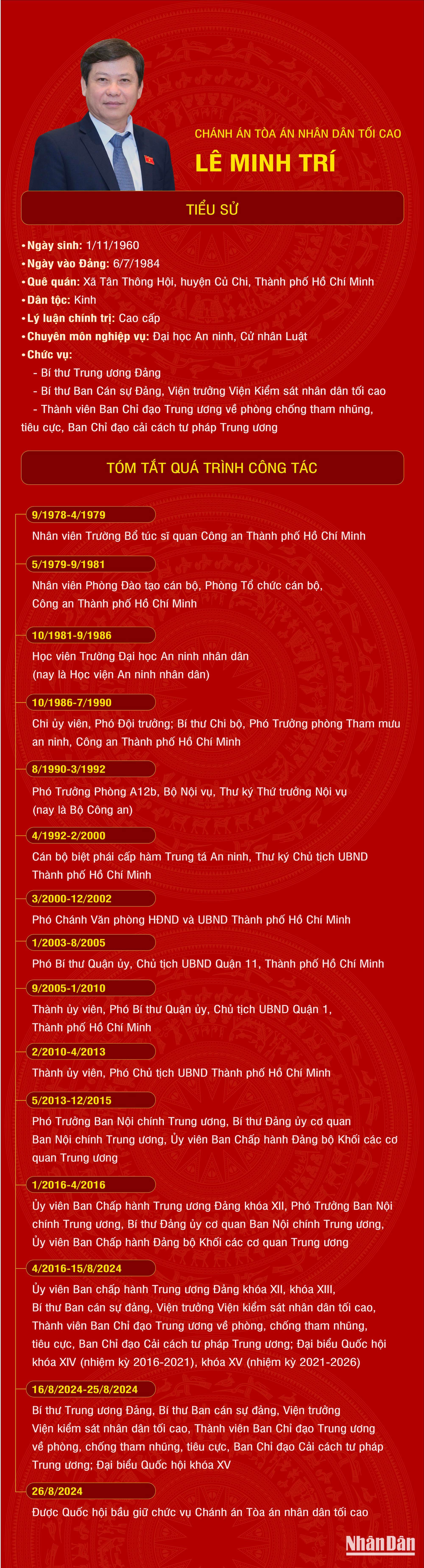 Ngày 26/8/2024, tại Kỳ họp bất thường lần thứ 8, Quốc hội khóa XV, Ủy viên Trung ương Đảng, Viện trưởng Viện Kiểm sát nhân dân tối cao Lê Minh Trí, đã được Quốc hội bầu giữ chức vụ Chánh án Tòa án nhân dân tối cao.
