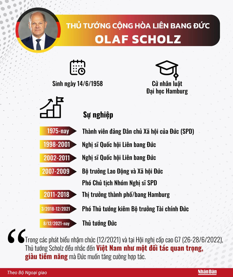 Ông Olaf Scholz (sinh năm 1958) là vị thủ tướng thứ 9 của Cộng hòa Liên bang Đức. Trong các phát biểu nhậm chức (12/2021) và tại Hội nghị cấp cao G7 (26-28/6/2022), Thủ tướng Scholz đều nhắc đến Việt Nam như một đối tác quan trọng, giàu tiềm năng mà Đức muốn tăng cường hợp tác.