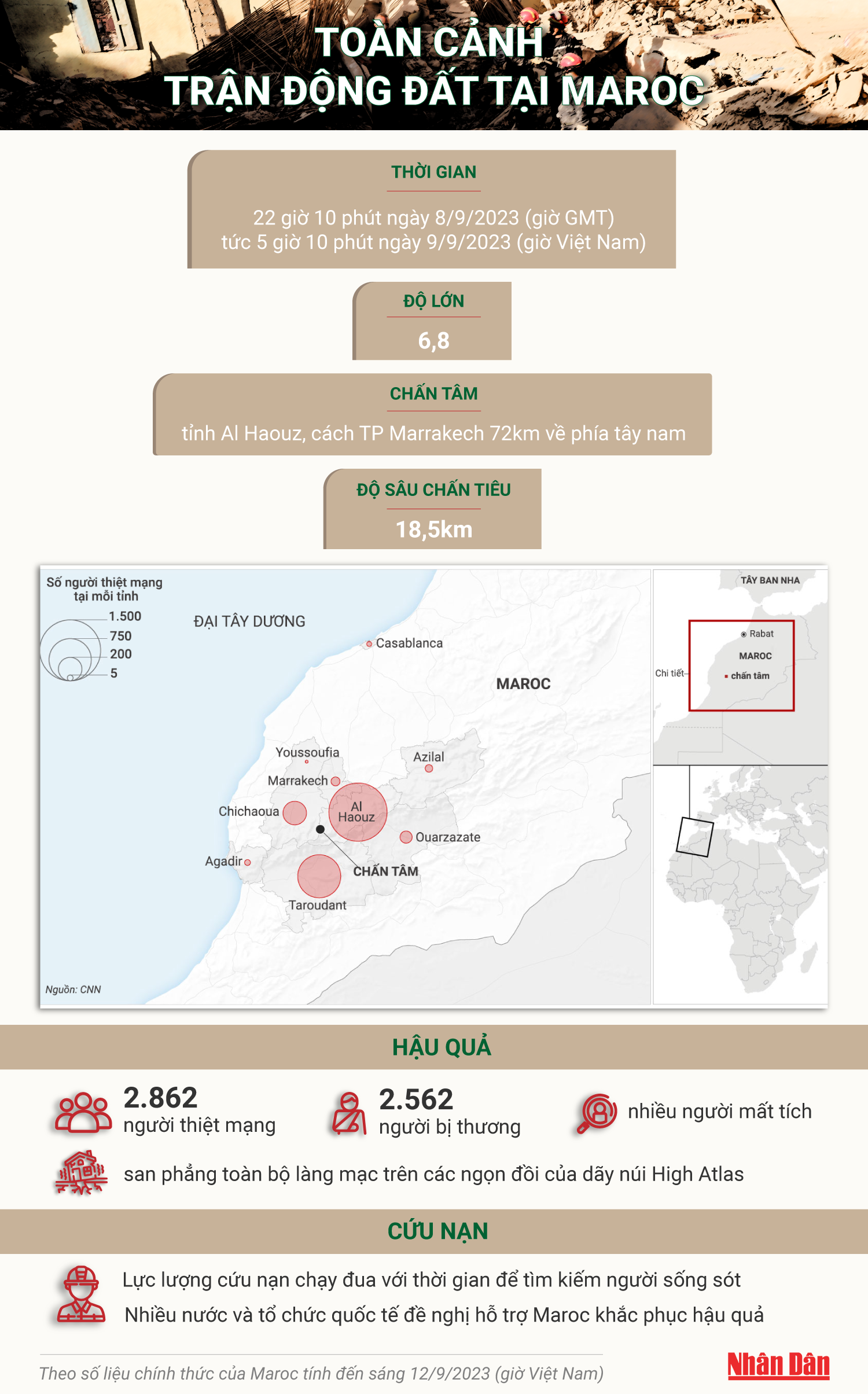 Theo số liệu mới nhất của Bộ Nội vụ Maroc, số nạn nhân thiệt mạng trong trận động đất có độ lớn 6,8 vừa xảy ra ở quốc gia Bắc Phi này đã tăng lên 2.862 người, trong khi 2.562 người khác bị thương. Đây là trận động đất gây nhiều thương vong nhất tại nước này kể từ năm 1960.