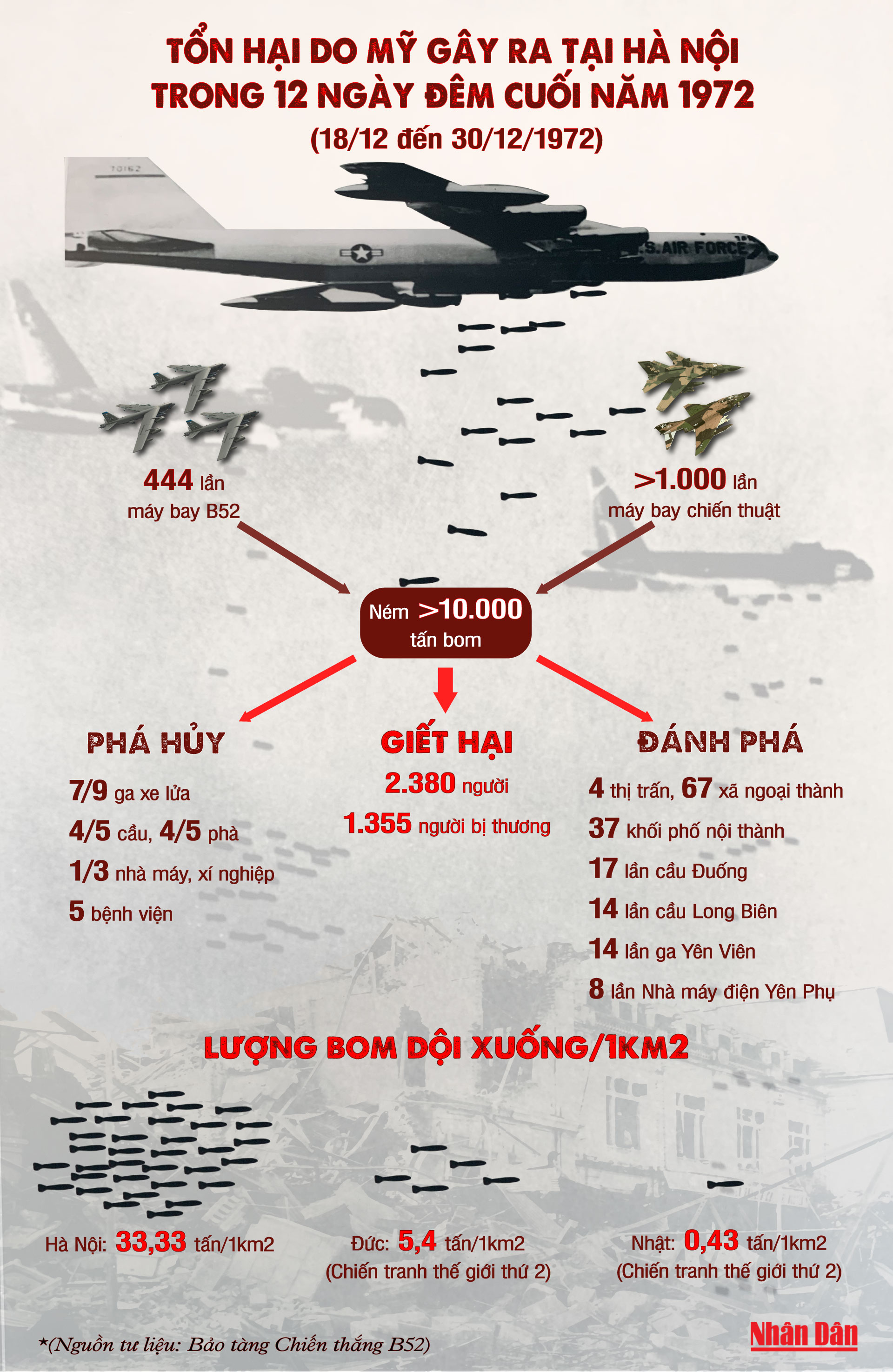 Trong 12 ngày đêm cuối năm 1972 (18 đến 30/12/1972), máy bay Mỹ đã ném hơn 10 nghìn tấn bom xuống Hà Nội, làm 2.380 người chết, 1.355 người bị thương, nhiều công trình nhà máy, xí nghiệp, bệnh viện,... bị phá hủy.
