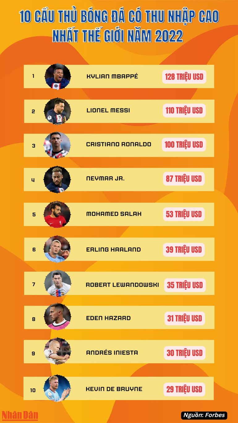 Lần đầu tiên sau 8 năm, vị trí dẫn đầu về thu nhập trong giới cầu thủ không thuộc về Lionel Messi hoặc Cristiano Ronaldo. Cái tên vượt lên dẫn đầu danh sách các cầu thủ bóng đá được trả lương cao nhất thế giới năm 2022 là sao trẻ Kylian Mbappe của Paris-Saint Germain, với mức thu nhập 128 triệu USD, con số cao kỷ lục trong bảng xếp hạng thường niên do tạp chí Forbes công bố.