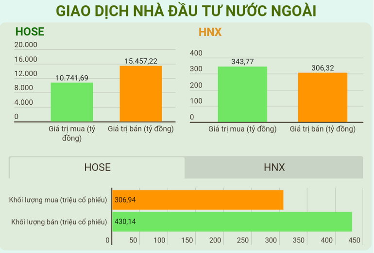 Nhà đầu tư nước ngoài gia tăng giao dịch đột biến trong tuần, tiếp tục bán ròng mạnh đột biến với giá trị 4.715,64 tỷ đồng trên HoSE, đây là đang là chuỗi bán ròng đột biến liên tiếp của khối ngoại trên HoSE, mua ròng trên HNX với giá trị 37,45 tỷ đồng.