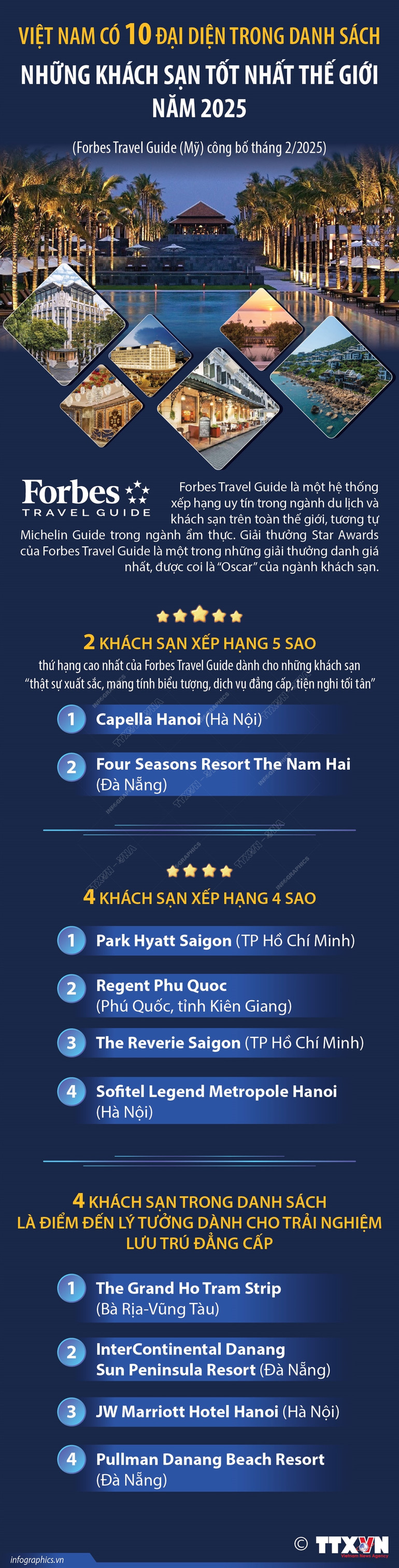 Capella Hanoi và Four Seasons Resort The Nam Hai là 2 đại diện của Việt Nam lọt top khách sạn 5 sao tốt nhất thế giới 2025 do Forbes Travel Guide (Mỹ) bình chọn. Ngoài ra, trong danh sách này, Việt Nam có 4 khách sạn xếp hạng 4 sao và 4 khách sạn trong danh sách là điểm đến lý tưởng dành cho trải nghiệm lưu trú đẳng cấp.