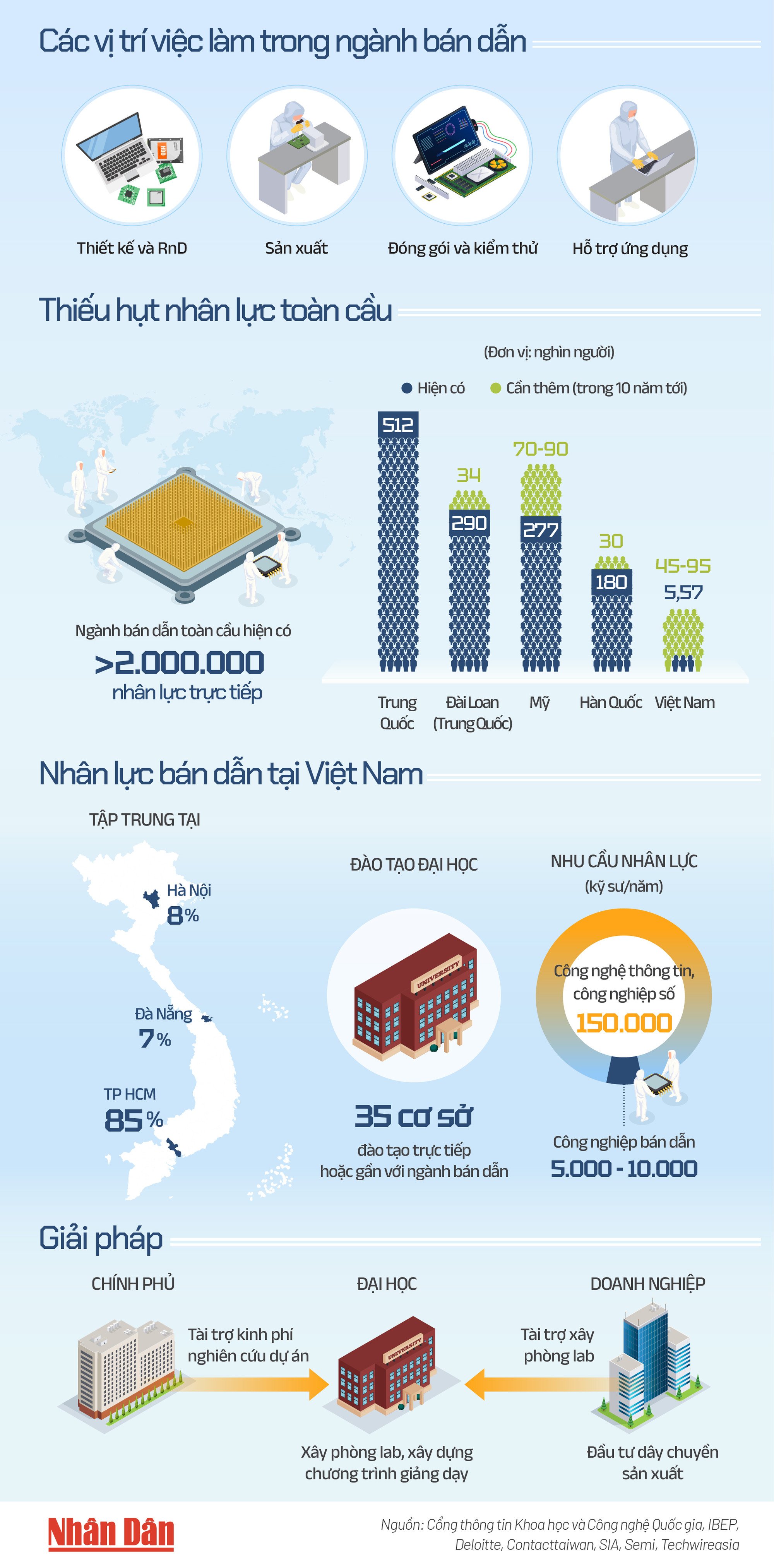 Việt Nam cần từ 5.000 đến 10.000 kỹ sư bán dẫn/năm nhưng khả năng bổ sung cho nguồn nhân lực này chỉ đạt khoảng 20%. Trong đó, quá bán (52%) nhân lực chủ yếu tập trung vào công đoạn thiết kế vi mạch.