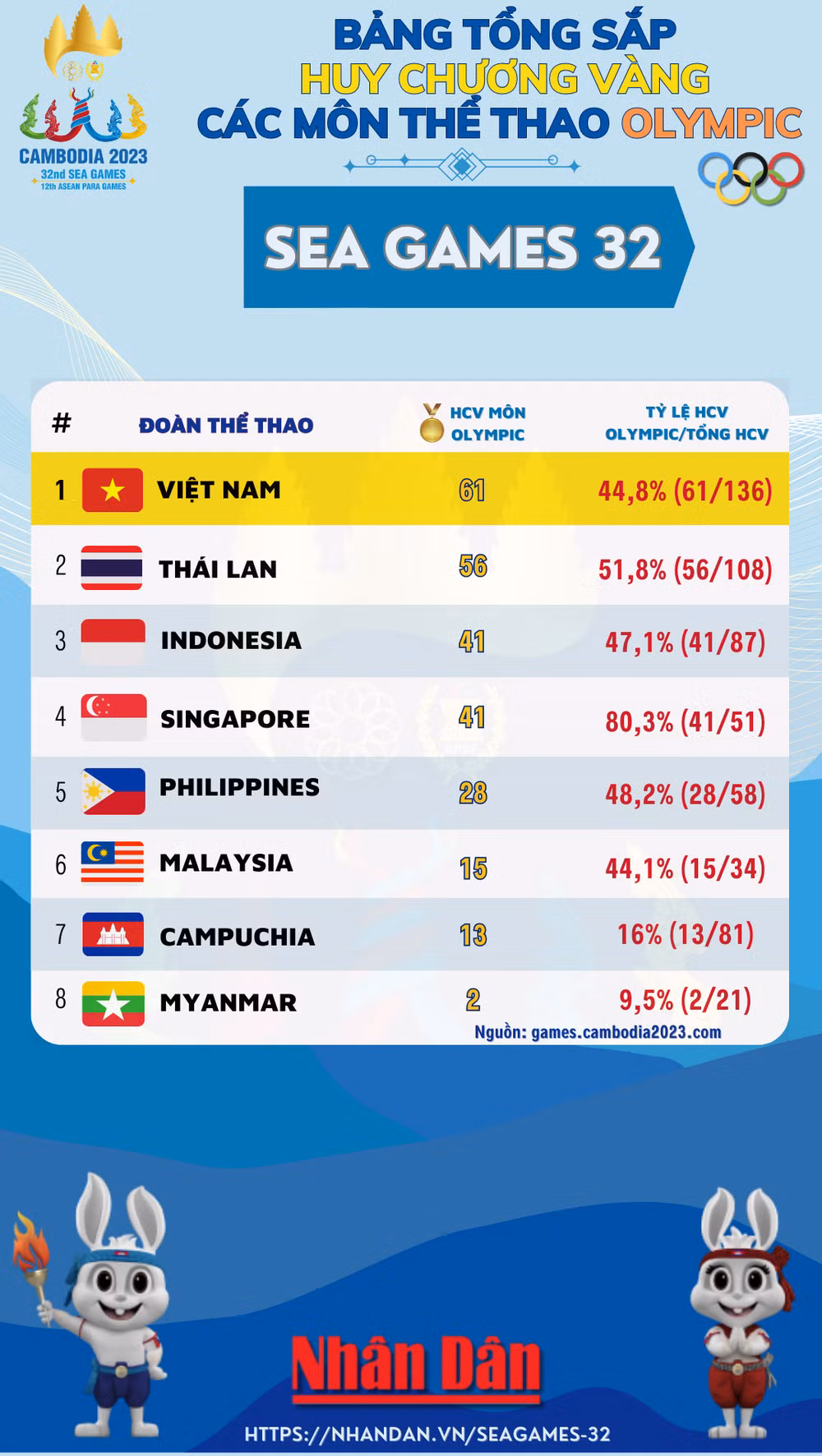 Theo đó, Đoàn Việt Nam giành 61/136 Huy chương Vàng, dẫn đầu bảng tổng sắp nhờ đồng đều ở các môn từ điền kinh, bơi đến các thế mạnh về môn võ, đấu kiếm, cử tạ… Trong khi đó, số Huy chương Vàng của Đoàn Thái Lan là 56/108, xếp thứ hai toàn đoàn.