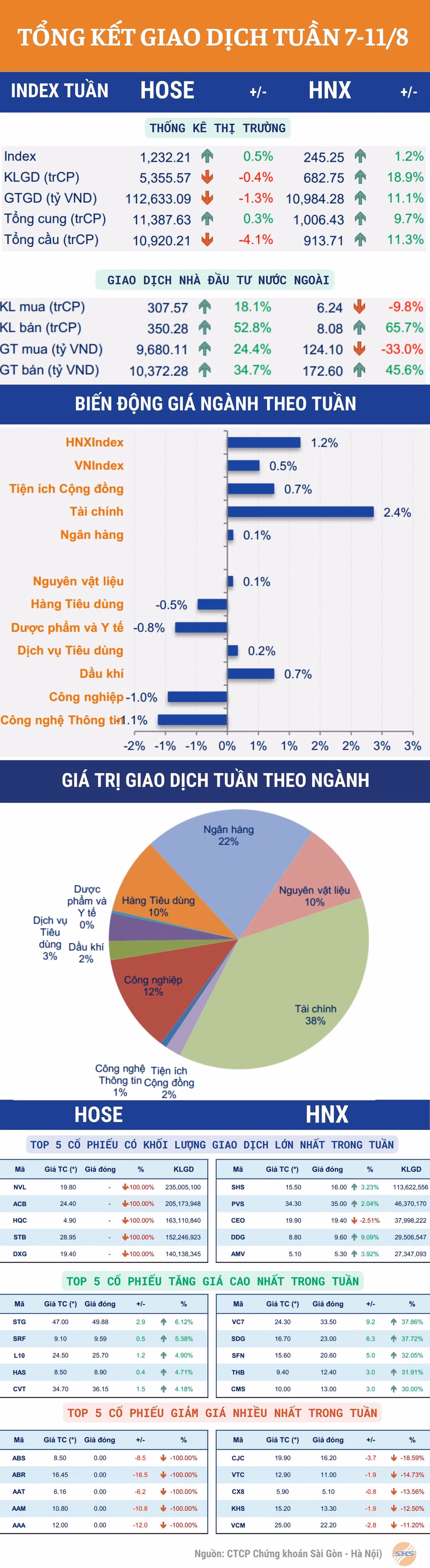 Tuần giao dịch 7/8-11/8: VN-Index đã có tuần tăng điểm thứ 6 liên tiếp, trong tuần thị trường có 3 phiên rung lắc mạnh, nhưng với phiên cuối tuần tăng điểm giúp chốt tuần VnIndex đóng cửa ở 1.232,21 điểm (tăng 6,23 điểm, +0,51%).