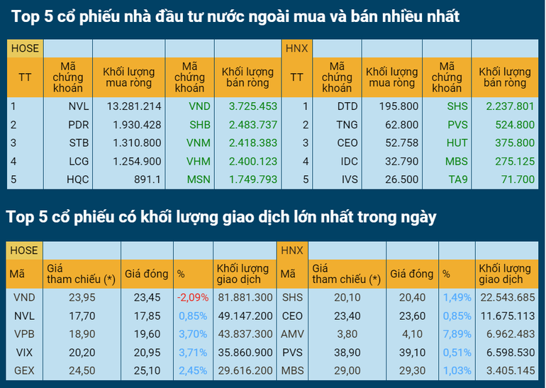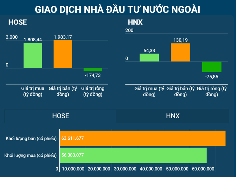 Nhà đầu tư nước ngoài tiếp tục bán ròng trên HoSE với giá trị 174,73 tỷ đồng, bán ròng trên HNX với giá trị 75,85 tỷ đồng.