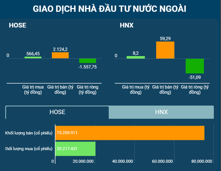 Nhà đầu tư nước ngoài gia tăng giao dịch, tiếp tục bán ròng mạnh với giá trị khá đột biến lên đến 1.557 tỷ đồng trên HOSE, trong đó bán ròng mở rộng ở các cổ phiếu ngân hàng, chứng khoán, bất động sản, thép; gia tăng bán ròng trên HNX với giá trị 51,09 tỷ đồng.
