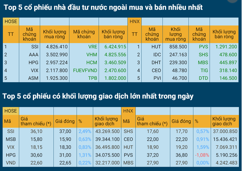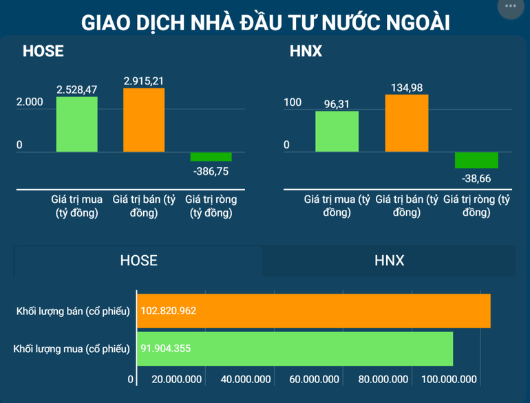 Khối ngoại gia tăng giao dịch, bán ròng khá mạnh trở lại trên HoSE với giá trị 386,75 tỷ đồng, trong đó bán ròng khá đột biến ở cổ phiếu VRE, VHM; tiếp tục bán ròng trên HNX với giá trị 38,66 tỷ đồng.