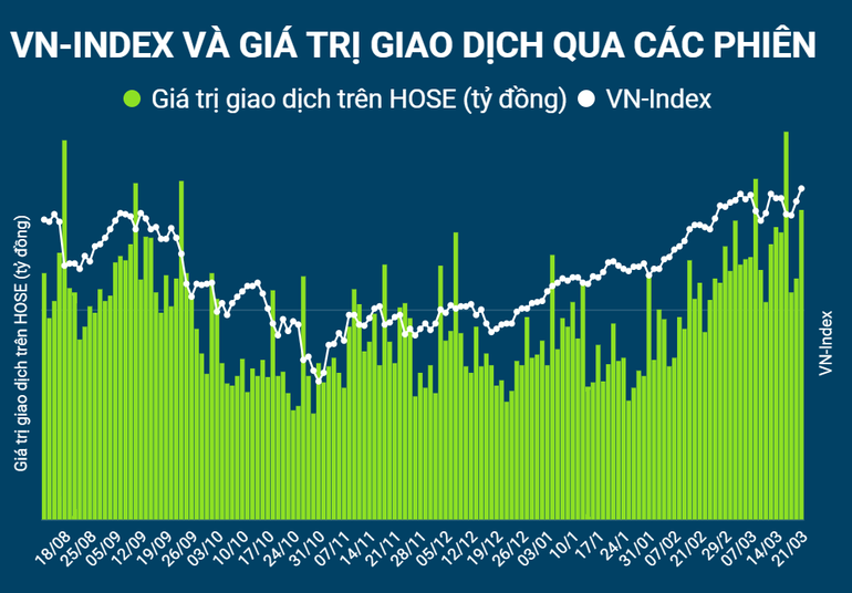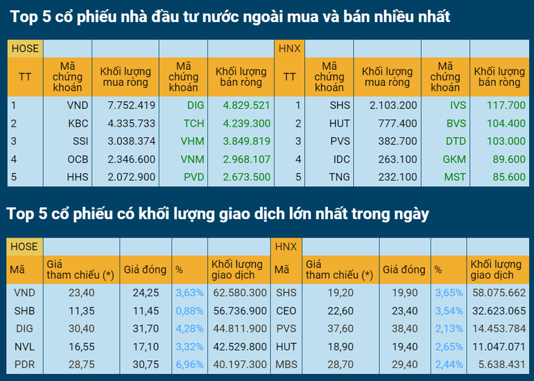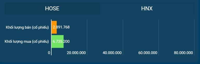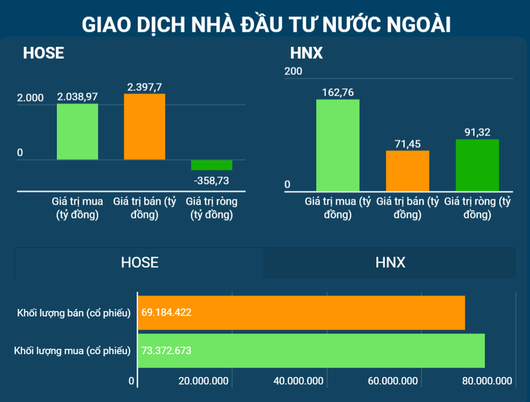 Giá trị khớp lệnh trên hai sàn niêm yết gia tăng mạnh 35% so với phiên trước với 33.156,39 tỷ đồng được giao dịch, vượt mức trung bình. Nhà đầu tư nước ngoài vẫn bán ròng với giá trị 358,73 tỷ đồng trên HoSE, mua ròng khá mạnh trên HNX với giá trị 91,32 tỷ đồng.