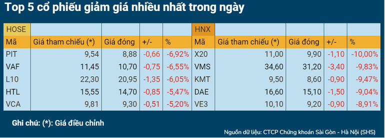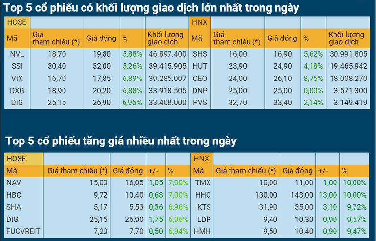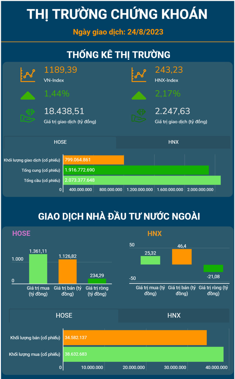VN-Index tăng 16,83 điểm (+1,63%) lên mức 1.189,39 điểm. HNX-Index tăng 5,16 điểm (+2,17%) lên mức 243,23 điểm. Thanh khoản trên hai sàn niêm yết đạt 20.595,96 tỷ đồng được giao dịch, tăng 11,99% so với phiên trước, quay trở lại gần mức trung bình của thị trường. Nhà đầu tư nước ngoài giảm mức độ giao dịch và mua ròng trở lại trên HOSE với giá trị 234,29 tỷ đồng; bán ròng trên HNX với giá trị 21,08 tỷ đồng.
