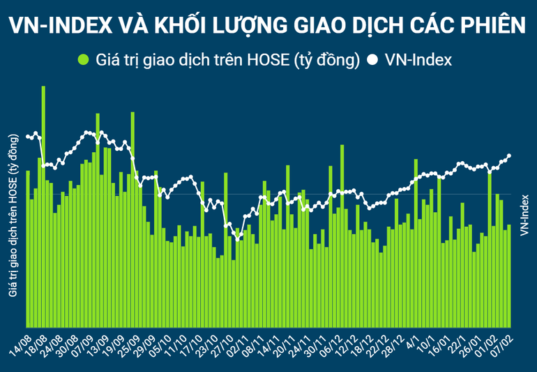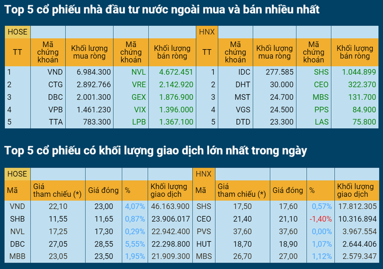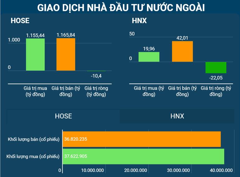 Thanh khoản trên hai sàn niêm yết đạt 16.688 tỷ đồng được giao dịch, tăng 1,52% so với phiên trước, dưới mức trung binh. Thị trường phân hóa tích cực, lực cầu, dòng tiền ngắn hạn luân chuyển liên tục ở các mã, nhóm mã. Khối ngoại giảm tỷ trọng giao dịch, bán ròng nhẹ trên HOSE với giá trị 10,40 tỷ đồng, tiếp tục bán ròng trên HNX với giá trị 22,05 tỷ đồng.