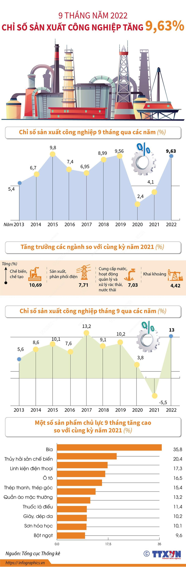 9 tháng đầu năm 2022, chỉ số sản xuất công nghiệp tăng 9,63% so với cùng kỳ năm 2021, trong đó công nghiệp chế biến, chế tạo tăng cao nhất 10,69%.