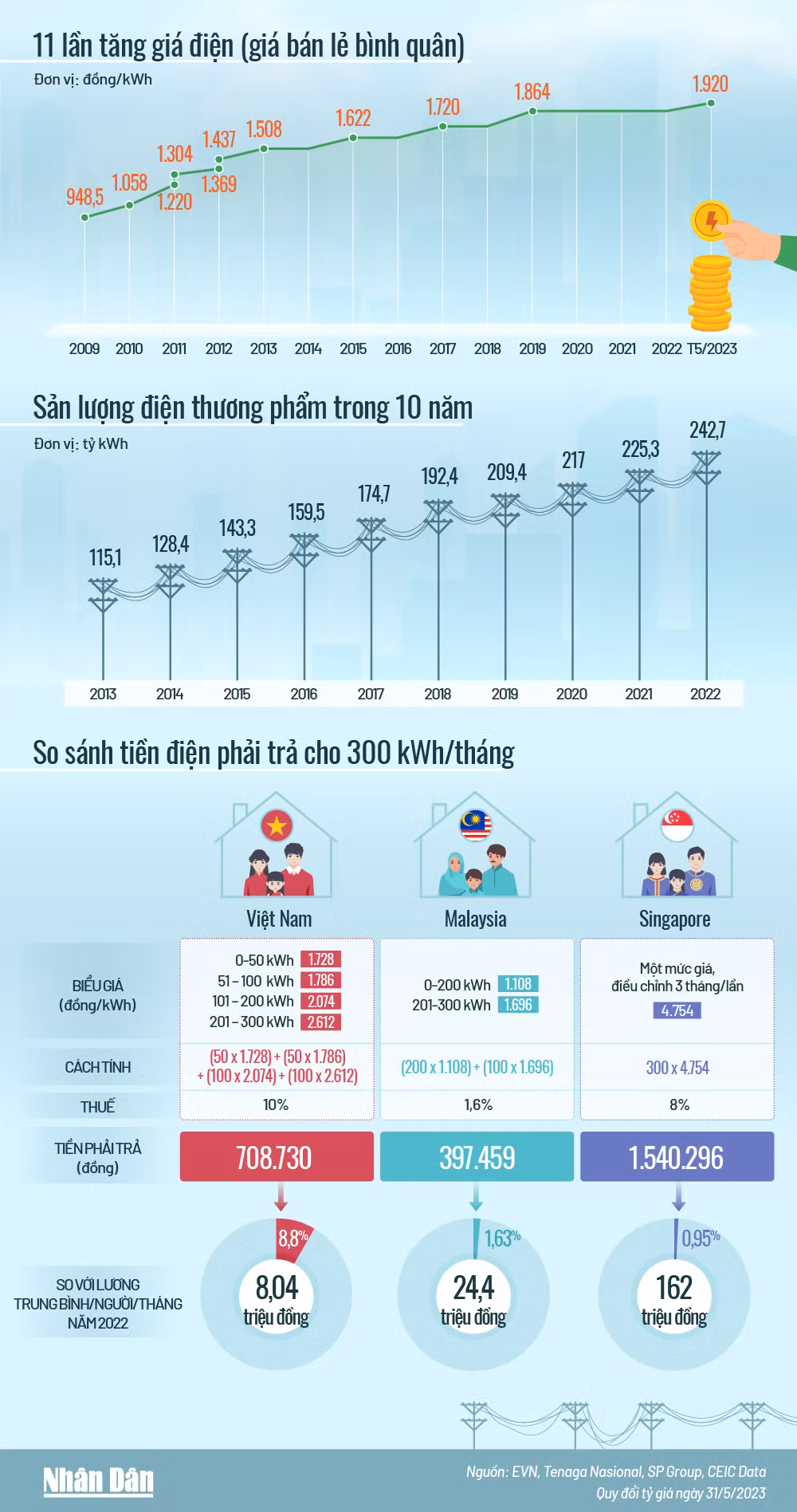 Từ năm 2009, Việt Nam đã trải qua 11 lần tăng giá điện bán lẻ bình quân. Sản lượng điện thương phẩm cũng tăng gấp đôi trong 10 năm. Trung bình, mỗi gia đình Việt Nam sẽ phải dành hơn 8% lương của một người để trả tiền điện hằng tháng trong khi con số này ở Singapore chưa tới 1%.