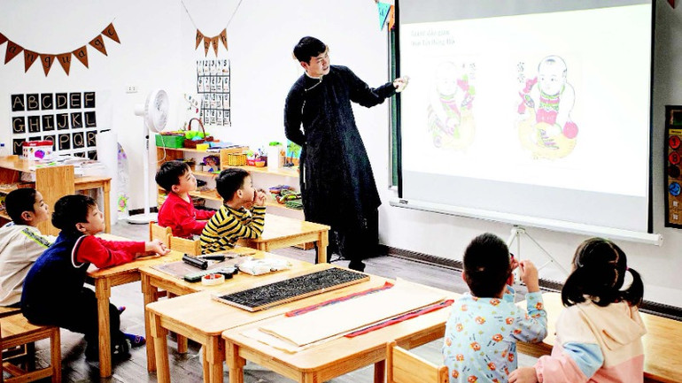 2-Họa sĩ Trần Quốc Đức dạy các em nhỏ về vẻ đẹp và ý nghĩa của tranh dân gian.