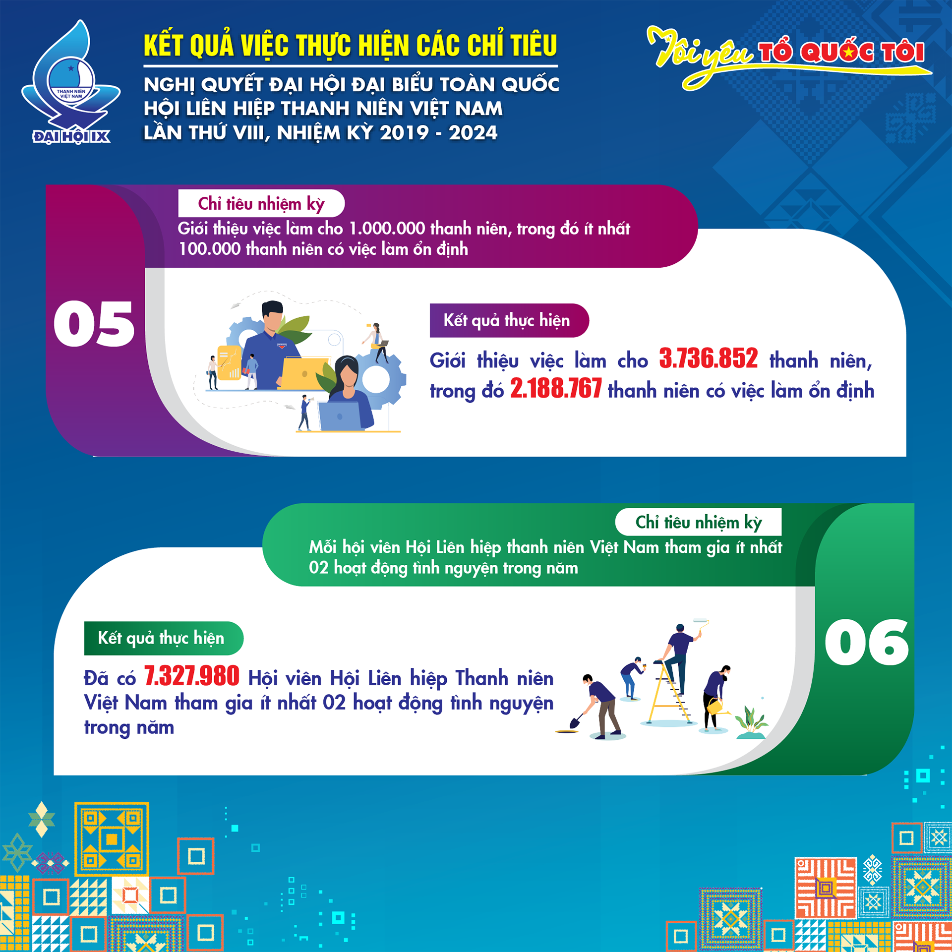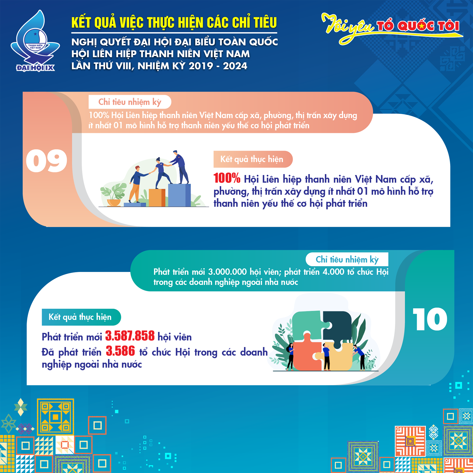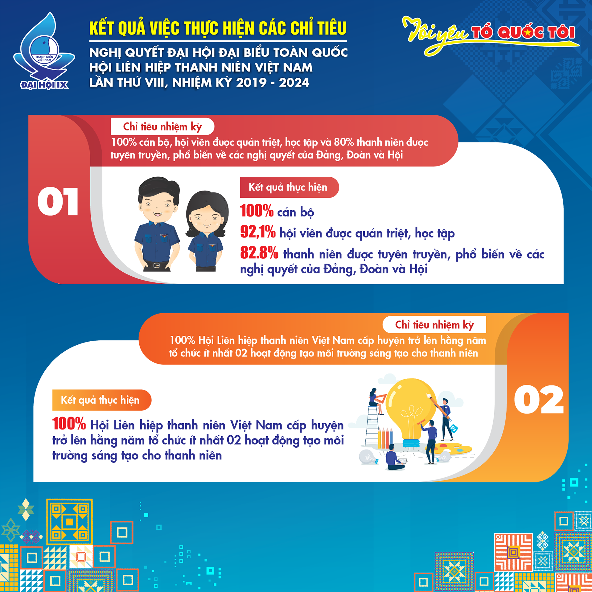Hội Liên hiệp Thanh niên Việt Nam lần thứ VIII, nhiệm kỳ 2019-2024 đã đề ra 10 chỉ tiêu nhằm sớm đưa Nghị quyết Đại hội đi vào thực tiễn, góp phần cổ vũ tinh thần xung kích, tình nguyện, xây dựng lớp thanh niên có ước mơ, hoài bão và khát vọng vươn lên lập thân, kiến quốc. 5 năm qua, Hội Liên hiệp Thanh niên các cấp luôn ra sức thi đua, tích cực hoàn thành các chỉ tiêu đề ra với tinh thần phấn đấu cao nhất.
