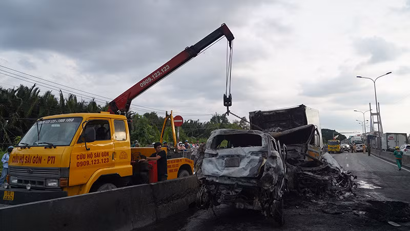 | Chiếc xe tải bị lửa thiêu rụi phần ca bin sau va chạm. |