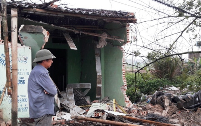 Một phần nhà dân bị đổ cùng cây xanh, do đầu xe ô-tô container BKS 15C-292.98 đâm vào.