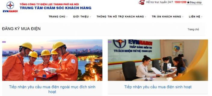 Giao diện dịch vụ đăng ký mua điện hạ áp trên website http://cskh.evnhanoi.com.vn.
