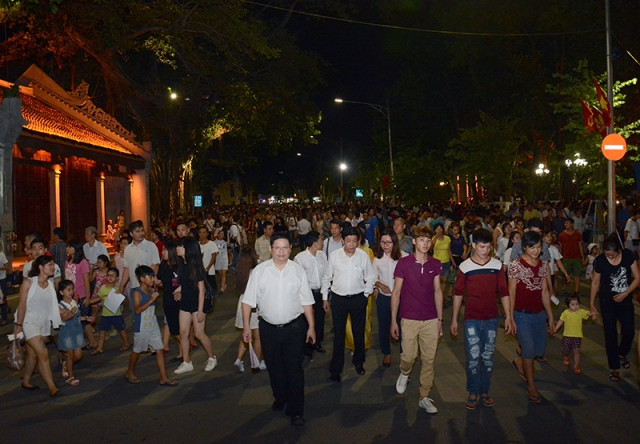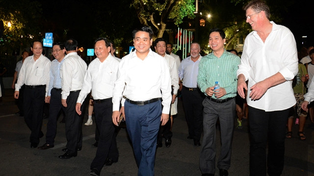 Chủ tịch UBND TP Hà Nội Nguyễn Đức Chung cùng các vị khách quốc tế đi bộ trên phố Đinh Tiên Hoàng. (Ảnh: DUY LINH).
