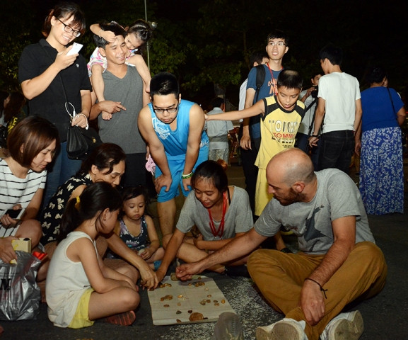 Một vị khách nước ngoài chơi ô ăn quan với các em thiếu nhi tại khu vực đền Ngọc Sơn. (Ảnh: DUY LINH).