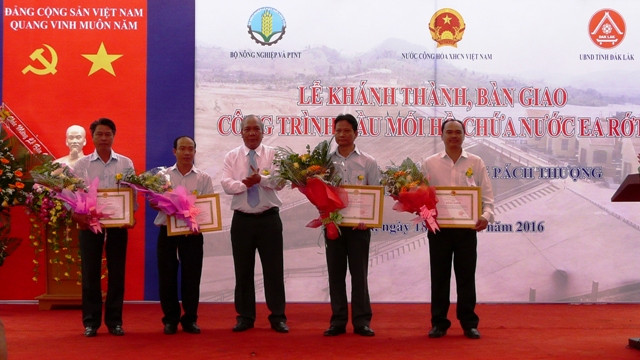 Lãnh đạo UBND tỉnh Đác Lắc tặng Bằng khen cho các tập thể, cá nhân có nhiều thành tích xuất sắc trong quá trình xây dựng công trình.
