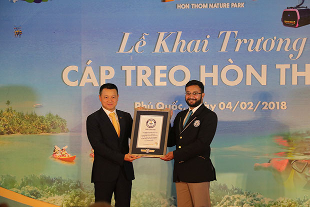 Tại buổi lễ khánh thành, Tổ chức Guinness đã trao tặng Chứng nhận Cáp treo Hòn Thơm là tuyến cáp treo dài nhất thế giới.
