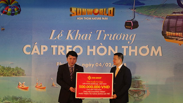 Đại diện Tập đoàn Sungroup trao 500 triệu đồng cho Liên đoàn bóng đá Việt Nam.