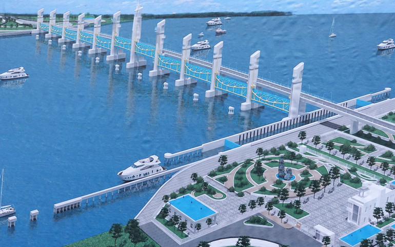 Sau khi đi kiểm tra các vị trí sạt lở đê biển, đoàn đã đến khảo sát vị trí xây dựng công trình cống Cái Lớn - Cái Bé. Đây là hệ thống thủy lợi điều tiết mặn, ngọt cho cả vùng bán đảo Cà Mau. Theo kế hoạch, giai đoạn I sẽ xây cống trên hai con sông Cái Lớn, Cái Bé, gần vị trí cửa sông đổ ra biển Tây, vốn đầu tư 3.310 tỷ đồng.