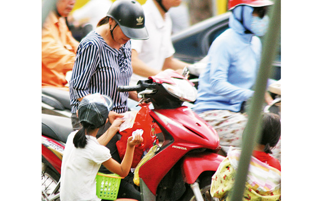 Cứ tầm sáu giờ chiều, khi đèn đường vừa bật sáng, bé Ngọc lại tất tưởi cầm giỏ đựng tăm bông, kẹo cao-su đứng ngóng khách tại ngã tư đường Lê Đức Thọ giao cắt với đường Nguyễn Hoàng (Nam Từ Liêm, Hà Nội). Cái nóng hừng hực từ mặt đường bốc lên và hơi nóng phả ra từ những chiếc xe máy nối đuôi nhau dừng chờ đèn đỏ khiến mồ hôi ướt đẫm khuôn mặt ngây thơ, non nớt của em. Tín hiệu dừng vừa bật sáng, Ngọc cùng Linh liều lĩnh lao ra trước dòng xe, miệng nhanh nhảu chào mời người đi đường mua kẹo. Thấy tôi, hai đứa trẻ ào đến ríu rít: “Chú ơi! Chú mua hàng cho cháu đi, đi mà, mua cho cháu đi”. Chưa dứt lời mời, hai em quay lại tranh nhau vị khách kế bên: “Để em bán, em đến trước mà”.