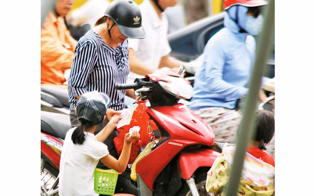 Trên dọc đê Hồng Hà (Hoàn Kiếm, Hà Nội), mỗi sáng, chị Hiền lại bế đứa con bé xíu, mới chừng sáu tháng tuổi chực chờ trên vỉa hè bán mấy món đồ lặt vặt. Dưới cái nóng như thiêu đốt những ngày cuối tháng sáu, mặt em bé đỏ bừng, mồ hôi ướt đẫm. Chiếc quạt nan luôn phe phẩy trên tay chị Hiền dường như không xua nổi oi bức của mùa hè. Ngay cạnh đó, bình sữa nằm chen bình nước, bám đầy bụi bặm. Khá nhiều người đi đường dừng lại xót xa cho tiền. Không thể phủ nhận, đứa trẻ bé xíu là nguyên do duy nhất khiến họ động lòng trắc ẩn.