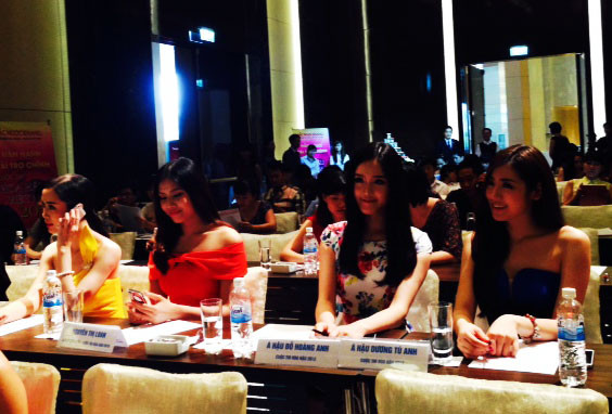 Các Á hậu Đỗ Hoàng Anh, Dương Tú Anh, người đẹp Nguyễn Thị Loan và Nguyễn Ngọc Anh tại cuộc họp báo.
