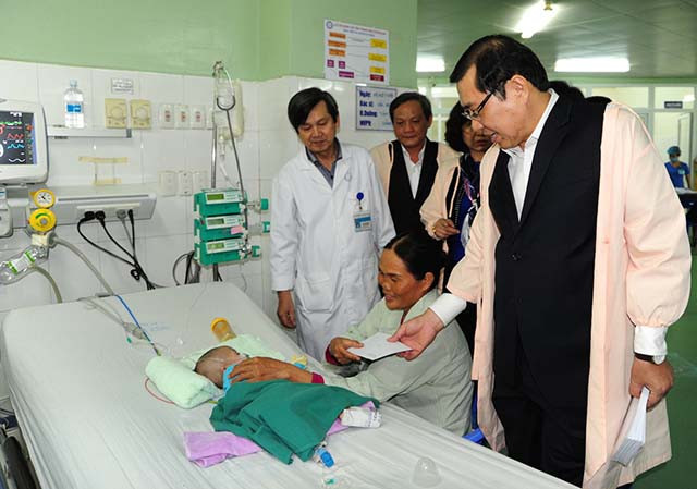 Đêm giao thừa, Chủ tịch UBND TP Đà Nẵng Huỳnh Đức Thơ đã tới thăm, tặng quà các bệnh nhi tại Bệnh viện phụ sản - nhi. (Ảnh: ANH ĐÀO)