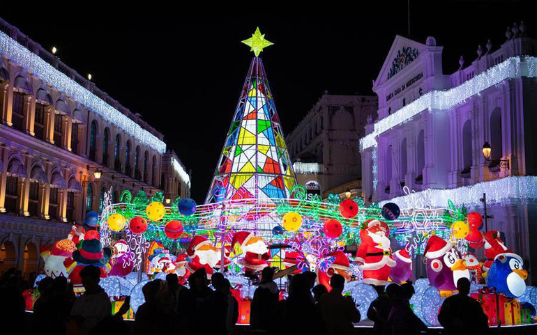 Khách du lịch và người dân tham gia lễ hội ánh sáng ở quảng trường Sendao, Macao, Trung Quốc (Ảnh: Xinhua)