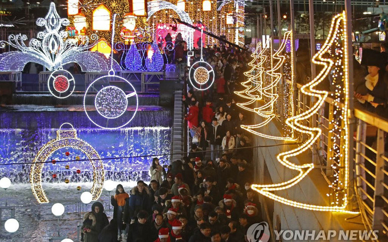 Các tác phẩm nghệ thuật ánh sáng ở Lễ hội Giáng sinh Seoul dọc theo dòng sông Cheonggye ở trung tâm Seoul, Hàn Quốc (Ảnh: Yonhap)