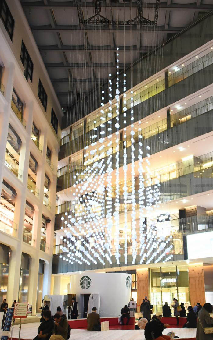 Một mô hình “cây thông Giáng sinh” tại tòa nhà Kitte ở thủ đô Tokyo, Nhật Bản được thực hiện theo nghệ thuật cổ mizuhiki, một cách tạo hình sử dụng dây làm bằng bánh tráng cuốn được phủ bột để làm cứng và được tô màu (Ảnh: JapanToday)