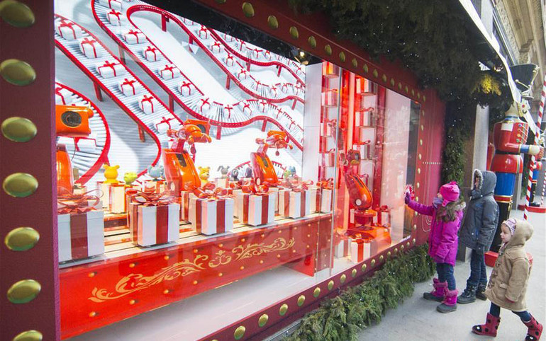Các em nhỏ thích thú ngắm mô hình Giáng sinh ở Toronto trong mùa lễ hội (Ảnh: Xinhua)