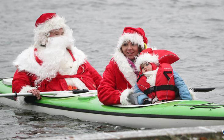 Một gia đình trong trang phục ông già Noel chèo thuyền kayak trong cuộc thi có hơn 500 người tham dự ở Misk, Belarus (Ảnh: Xinhua)
