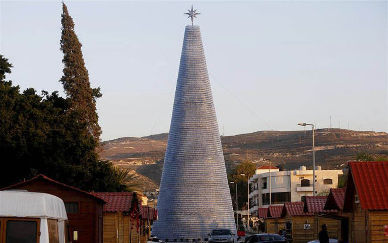 Thành phố Chekka, Lebanon đã thắp sáng một cây thông Giáng sinh cao 28,5 m được làm bằng hơn 120.000 chai nhựa. Người dân và binh sĩ phải mất 20 ngày để hoàn thành cây thông Giáng sinh độc đáo này. Người dân nơi đây kỳ vọng cây thông bằng chai nhựa sẽ lập kỷ lục Guiness năm nay (Ảnh: Xinhua)