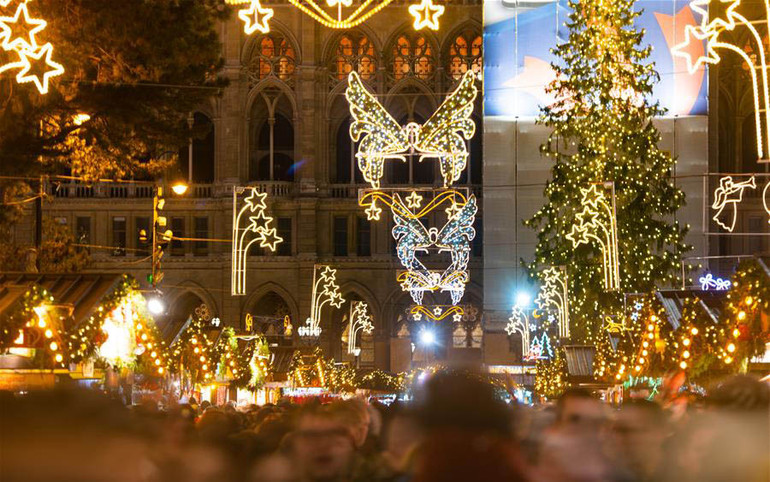 Một trong những khu chợ Giáng sinh cổ và nổi tiếng nhất châu Âu tại thủ đô Vienna, Áo thu hút người dân và khách du lịch mỗi năm trong suốt mùa lễ hội (Ảnh: Xinhua)