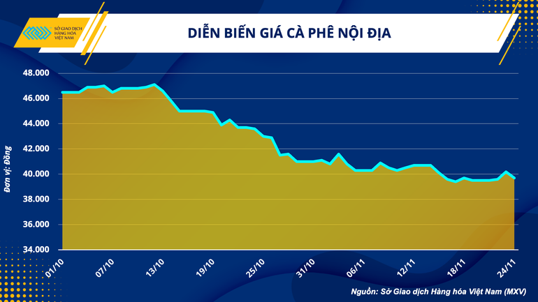 Tại Việt Nam, giá cà-phê nội địa cũng không thoát khỏi xu hướng giảm của cà-phê nói chung. Nguồn cung nới lỏng khi vụ thu hoạch mới diễn ra là yếu tố chính khiến giá giảm. Bên cạnh đó, đồng Dollar Mỹ tăng cao cũng thúc đẩy lực bán từ phía nông dân, góp phần khiến giá giảm hơn 10.000 VNĐ/kg trong gần 2 tháng.