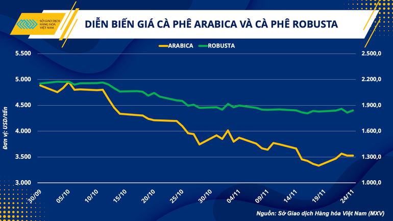 Nguồn cung của Robusta cũng trở nên tích cực hơn khi Việt Nam, quốc gia cung ứng Robusta số một thế giới chính thức bước vào vụ thu hoạch, khiến nhu cầu đẩy nguồn cung ra thị trường tăng cao. Theo ước tính của các chuyên gia, tính đến ngày 20/11, 38% diện tích trồng cà-phê tại Việt Nam đã được thu hoạch. Lượng cà-phê thu hoạch càng lớn, nhu cầu đẩy mạnh xuất khẩu càng gia tăng do nông dân cần kho để chứa cà-phê của vụ mới.