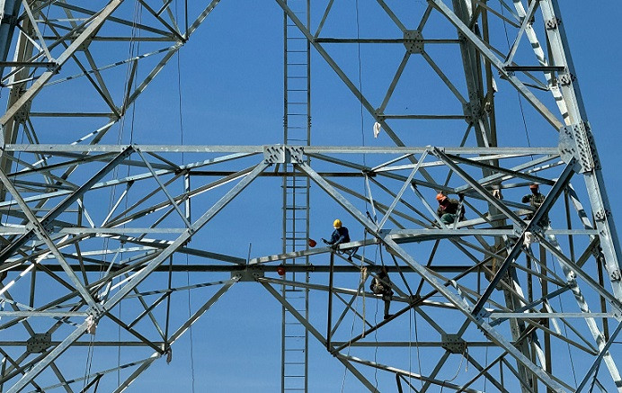 | Công nhân thi công đang gấp rút hoàn thành cột điện. |