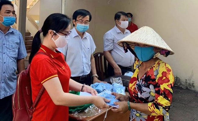 Nhân viên Công ty Xổ số kiến thiết Kiên Giang trao quà cho người bán vé số.