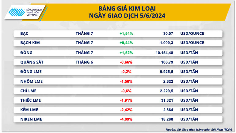 Kết thúc ngày giao dịch 5/6, thị trường kim loại diễn biến phân hóa. Tương tự dầu thô, cả hai kim loại quý là bạc và bạch kim đồng loạt phục hồi trong sắc xanh sau khi Mỹ công bố dữ liệu kinh tế yếu. Chốt ngày, giá bạc tăng 1,54% lên 30,07 USD/ounce, giá bạch kim lấy lại mốc 1.000 USD/ounce sau khi tăng 0,44%.