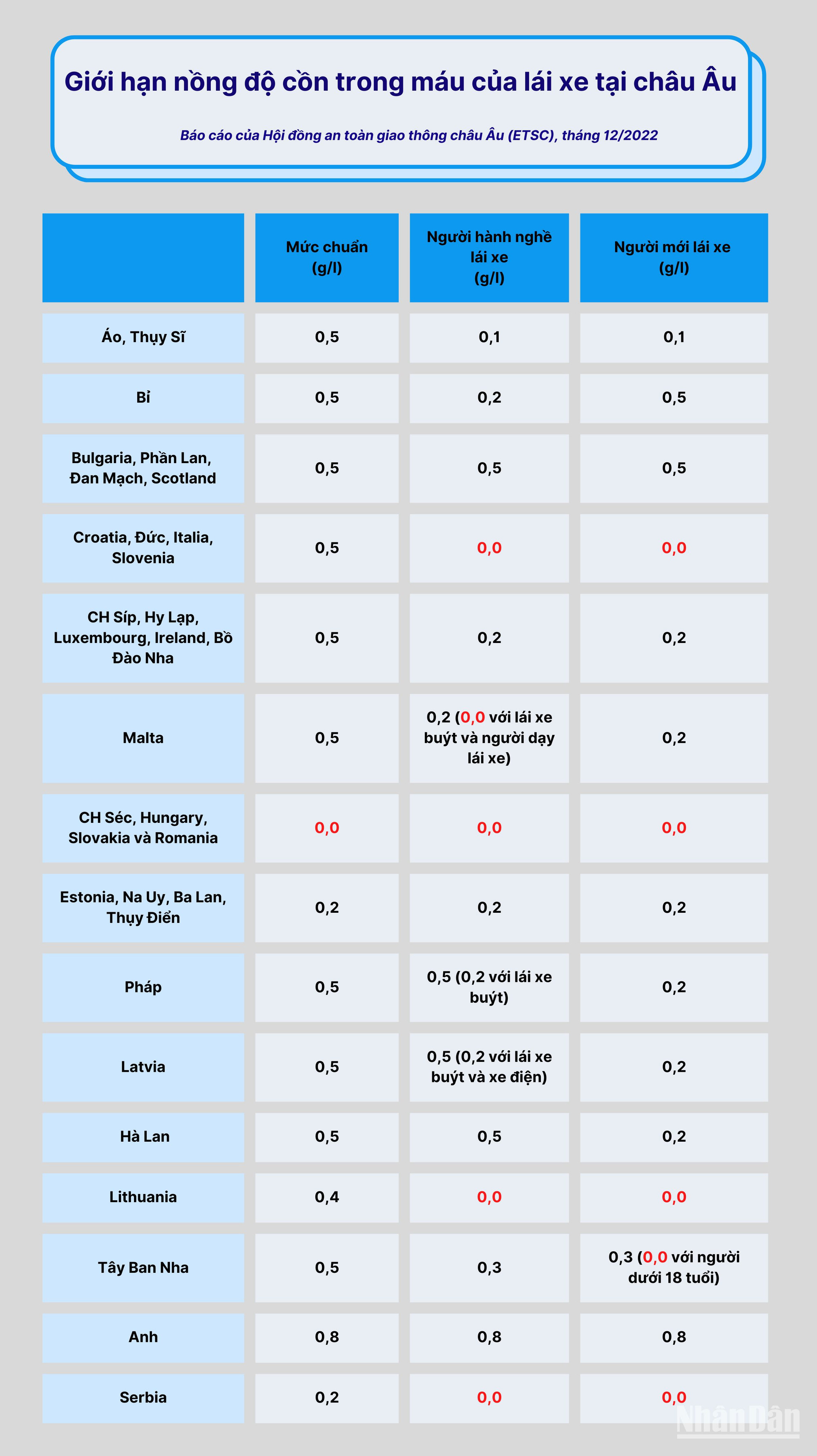 Ủy ban châu Âu đã khuyến nghị các quốc gia thành viên áp dụng mức cho phép thông thường không vượt quá 0,5g/l. Ở châu Âu, phần lớn các quốc gia đều tôn trọng ngưỡng này, ngoại trừ Vương quốc Anh và Malta. Một số quốc gia đã đưa ra mức quy định nồng độ cồn trong máu thấp hơn đối với những người lái xe có ít kinh nghiệm trên đường (thường là dưới 5 năm).