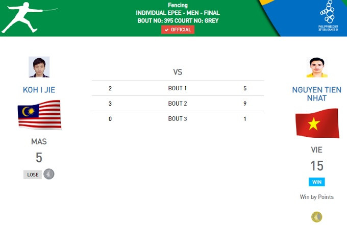 Kiếm thủ Việt Nam vượt qua đối thủ Malaysia Koh I Jie 15-5 ở chung kết kiếm ba cạnh cá nhân nam. Đây là HCV thứ hai của đấu kiếm Việt Nam ở SEA Games năm nay, sau chức vô địch kiếm chém nam của Vũ Thành An trước đó.