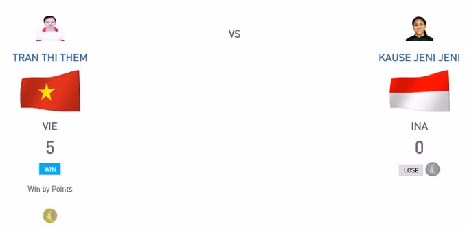 Nữ võ sĩ Trần Thị Thêm giành chiến thắng tuyệt đối 5-0 trước đối thủ người Indonesia, Kause Jeni Jeni, trong trận chung kết đối kháng hạng 50-55kg, để đem về tấm HCV đầu tiên cho đoàn TTVN trong ngày 5-12. Đây cũng là HCV đầu tiên mà đội tuyển Pencak silat Việt Nam giành được ở kỳ SEA Games năm nay.